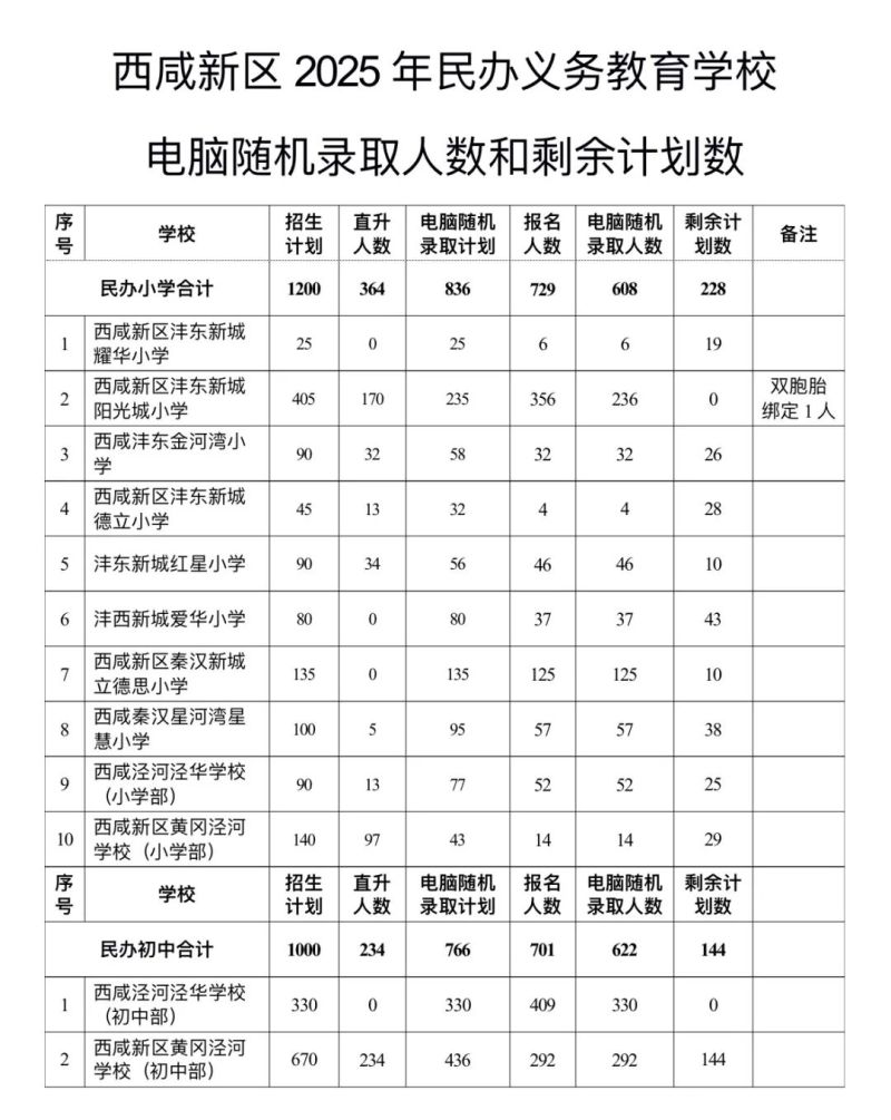 西咸新区2025年民办义务教育学校电脑随机录取人数和剩余计划数