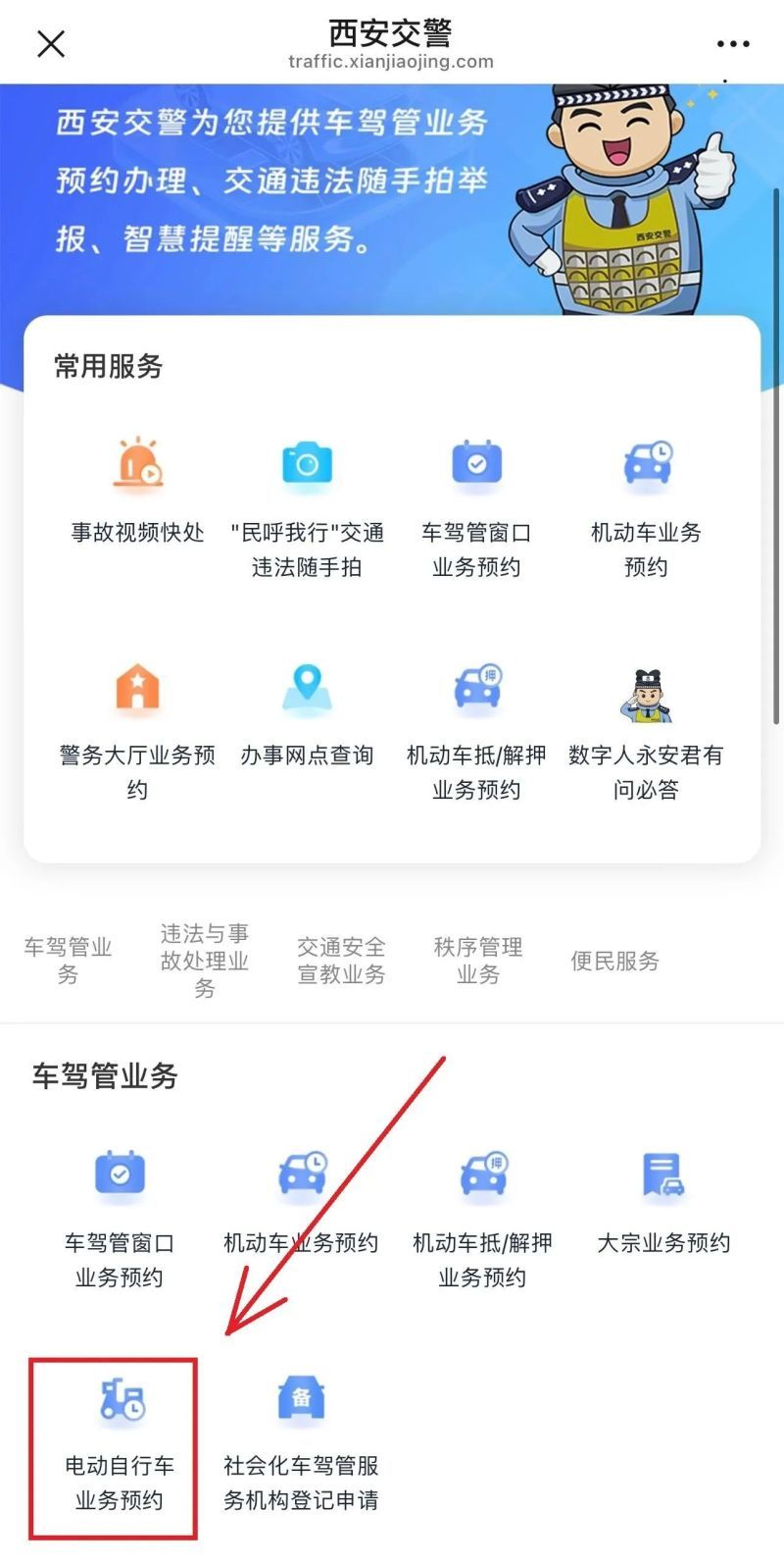 第一步:关注“西安交警”微信公众号,点击“业务办理”,随后点击“电动自行车业务预约”,按照流程填写相关信息,选择合适的挂牌地点进行预约。